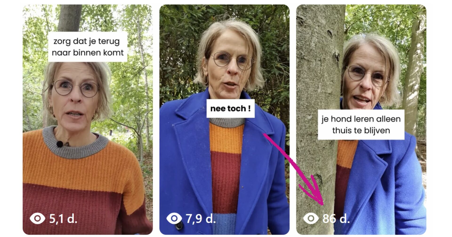 “Het was voor mij echt een ontdekking dat video´s op social media veel beter gezien worden dan foto´s. En dat is wat ik wilde: meer hondeneigenaren bereiken. Laura is de aanjager geweest voor mijn video’s. Ik loop nu rond op mijn werk en denk: ‘Hier moet ik een video van maken!’ Ik heb mijn perfectionisme meer losgelaten en maak daardoor veel meer video’s. Waar ik voorheen een foto maakte, ben ik nu bewuster bezig met video’s maken.”