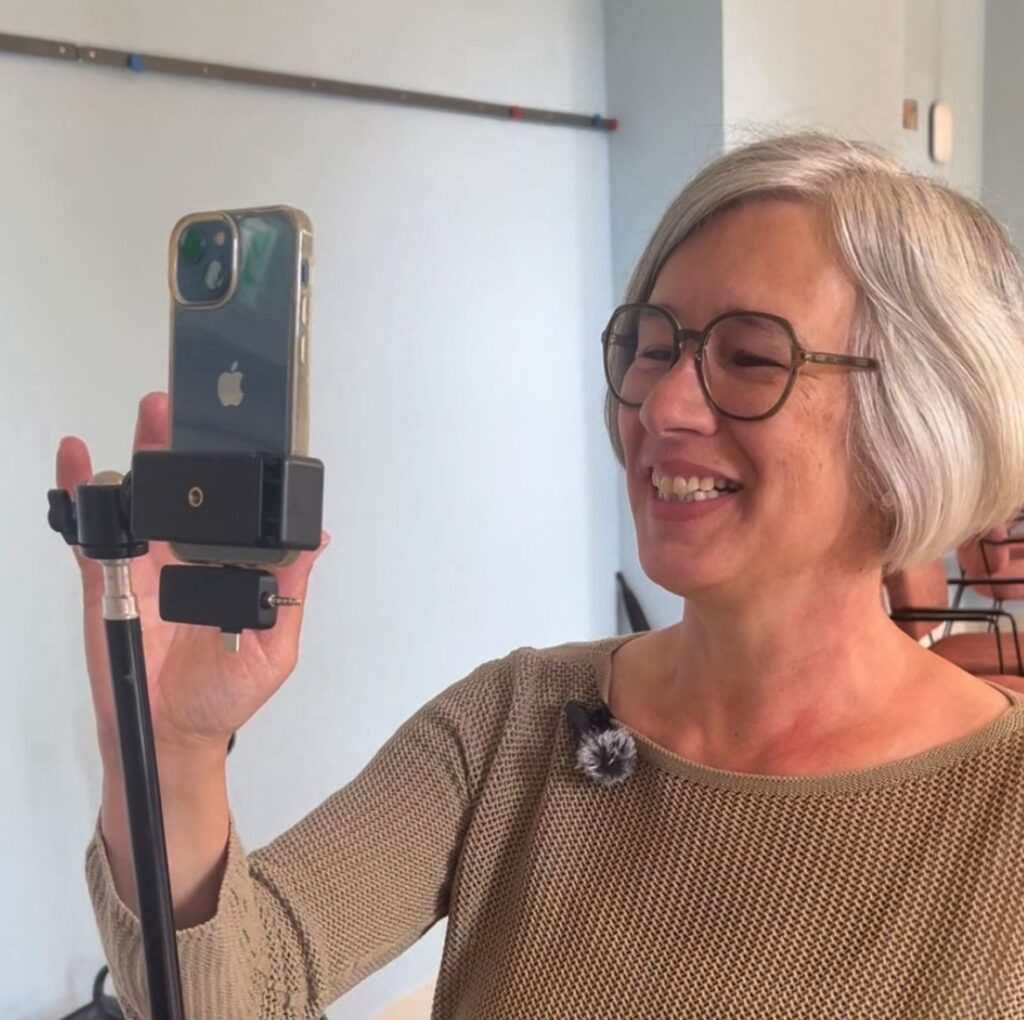 Wilma kwam goed voorbereid met een zelfgeschreven tekst. Tijdens de training deelde Wilma haar tekst met de groep én kreeg ze van mij extra tips voor een krachtige, vrolijke intonatie passend bij de boodschap. Na deze inspiratiesessie met de andere deelnemers (4 totaal, lekker klein en persoonlijk), bespraken we wat voor tussenbeelden je kunt maken. Want alleen praten in beeld is oké – maar soms ook een tikje… saai. 😉